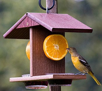 Duncraft , Provide a buffet for your birds!Includes two cups for grape jelly, and two skewers for orange halves - orioles favorite foods! Or you can spike apple halves and fill the cups with mealworms or suet Nuggets for other fruit and insect-loving birds. The options are unlimited!The feeder is crafted of plastic wood , a durable and hygienic material that stays beautiful for years. Comes in a two-toned color with a wood-grain finish. Roof always keeps the food dry. Cups and feeder are even dishwasher safe! The dimensions are 6 x 10 x 8 inches tall.
