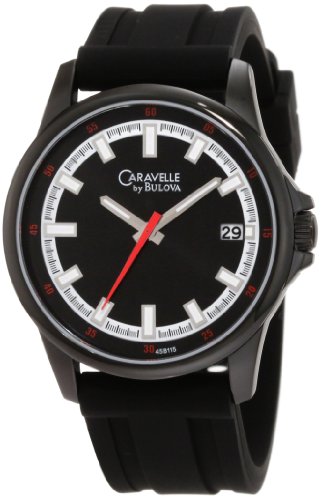 Caravelle by Bulova Men's 45B115, Men's Caravelle by Bulova sport watch featuring a strap design with patterned black dial, luminous hands and markers, calendar, red second hand, patterned black rubber strap and water resistance to 30 meters.